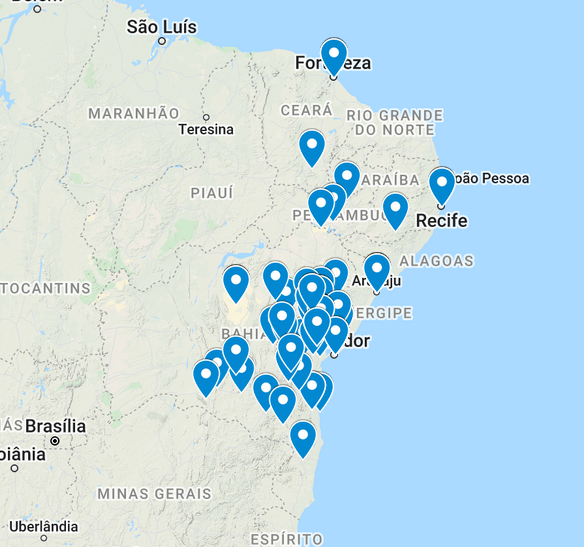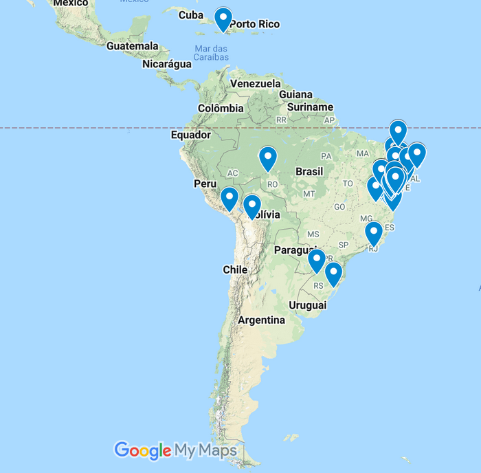 A seguir são apresentados mapas com marcadores em azul identificando as cidades de origem dos egressos, mostrando o alcance e visibilidade do Programa. Vê-se que a maioria dos egressos são da Bahia, mas pode-se perceber não apenas uma visibilidade local e estadual, mas também regional e até continental.